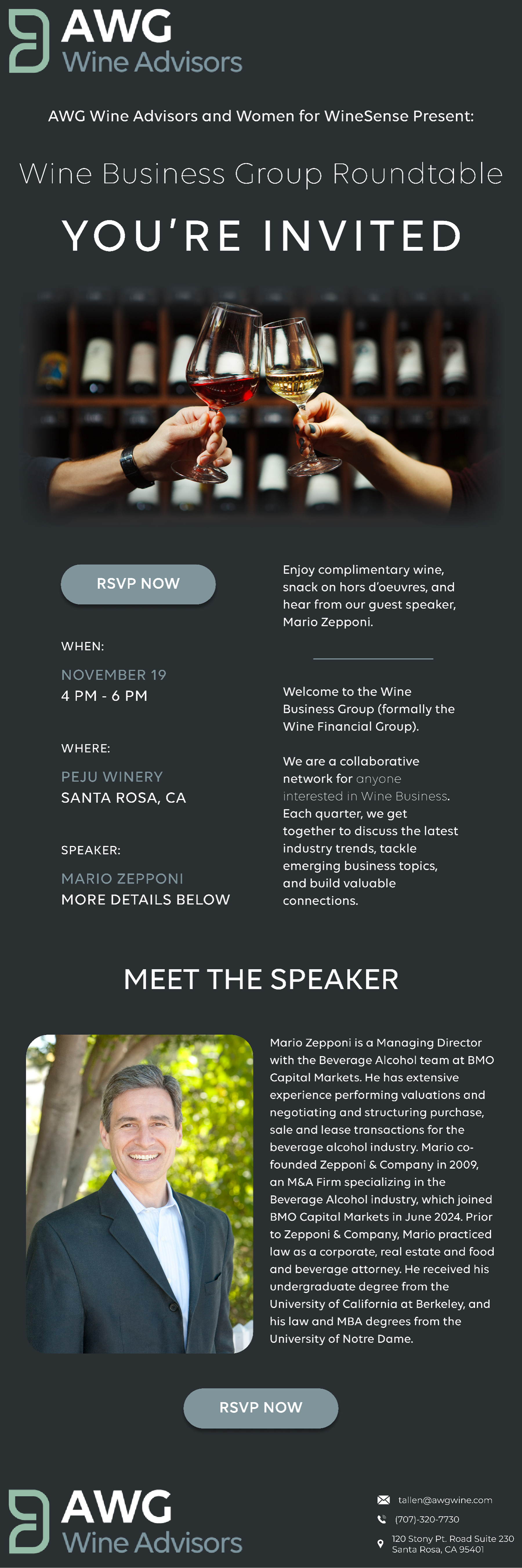 Provi Damien Wilson Wine Business Institute Sparkman Cellars Sigillo Cellars Napa Green Regenerative Viticulture Foundation Petaluma Gap Winegrowers Alliance Benchmark Wine Group LVMH Enolytics Nat DiBuduo Linda Reiff Napa Valley Vintners Ayana Misawa Grace Wine Robert Joseph K'Avshiri Clevertech InnoVint Wunderlich-Malec Engineering ATPGroup Stags Leap District Winegrowers Association Argyle Winery Madeira Wine Institute